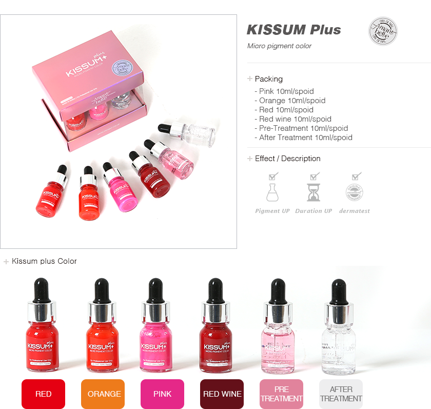 Kissum tint for lips consists of 6 bottles, pre-treatment solution, 4 colors and after-treatment solution.